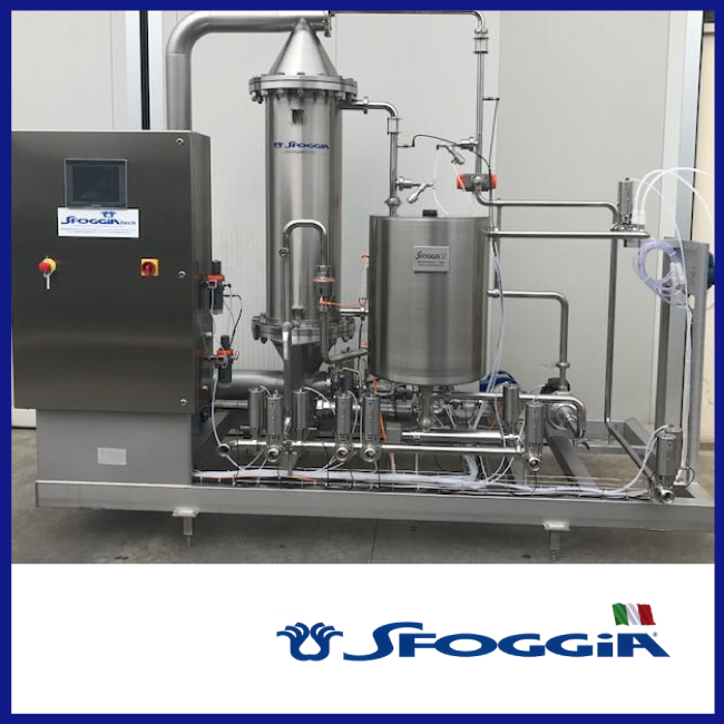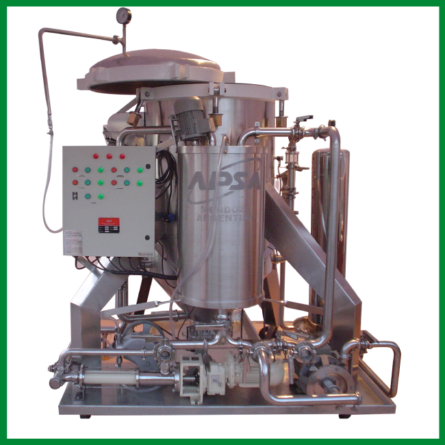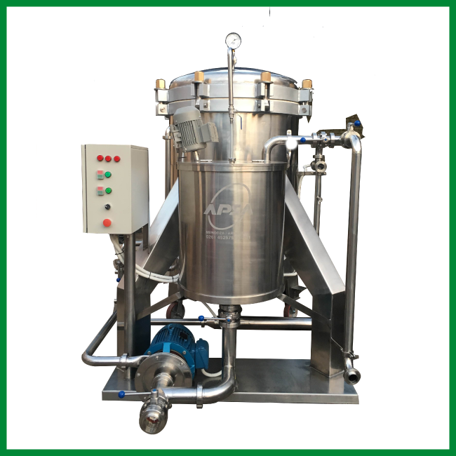 Filtro a tierras de diatomeas con placas verticales, superficie 53 m², equipado con bomba a tornillo para la filtración de mostos concentrados.